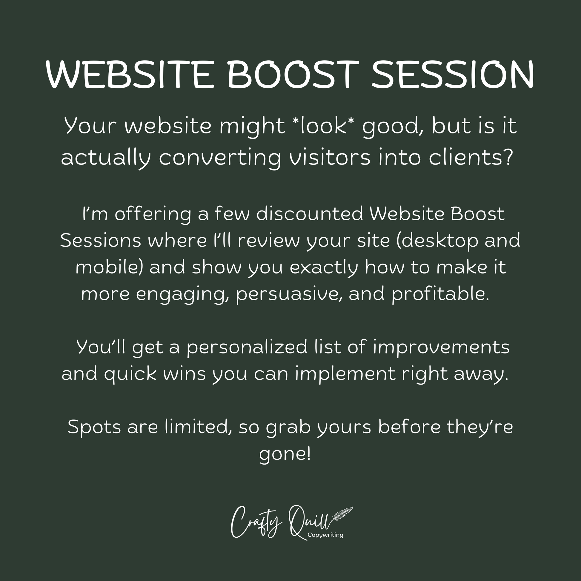 This Website Boost Session is a special opportunity to get an expert review of your website’s copy and design on both desktop and mobile. I will screen record as I review your website and transcribe the audio so you always have your Website Boost Session to refer back to!